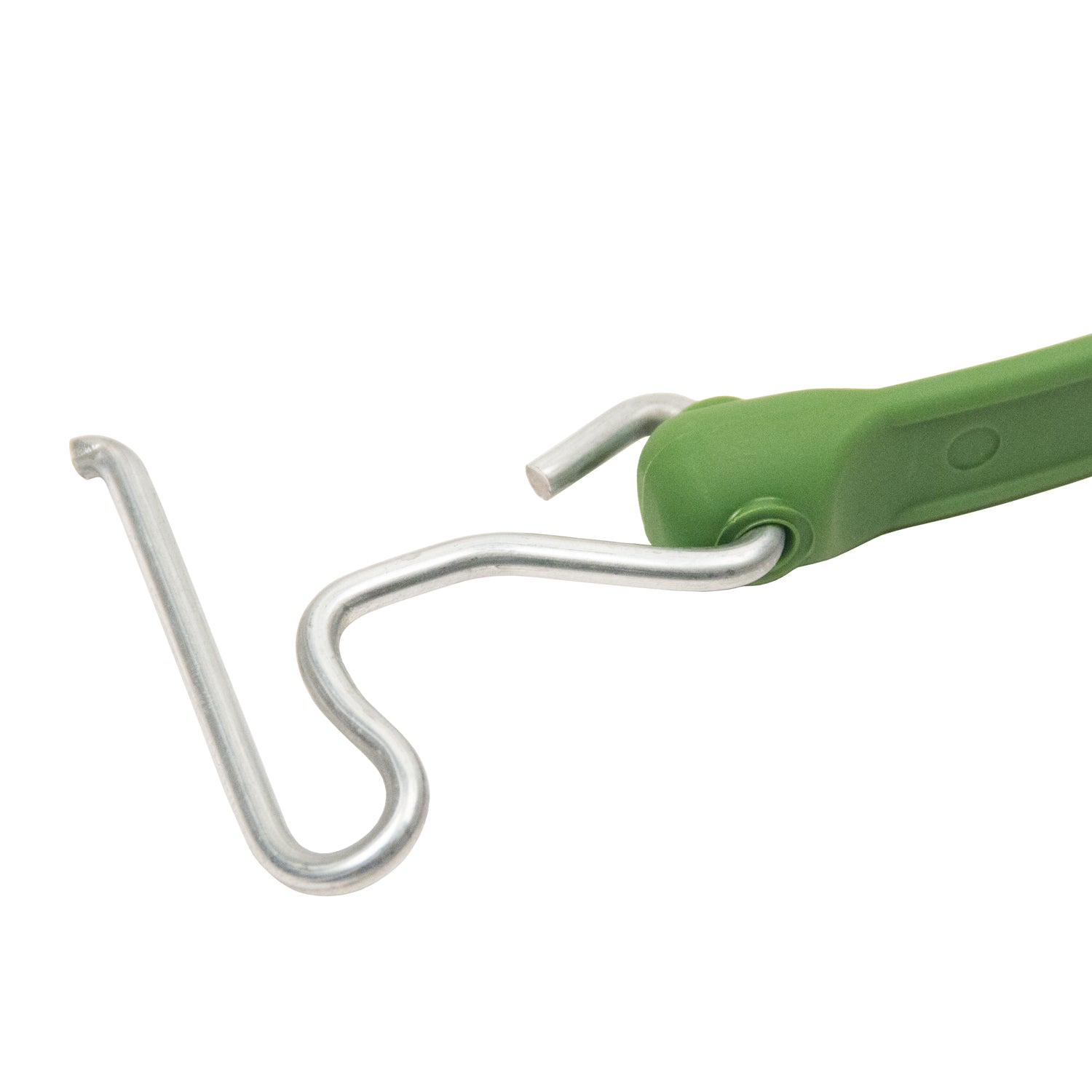 Our heavy-duty Tarp Straps are Military Green, 24" long, and feature a galvanized S hook on one end and tarp hook on the other.